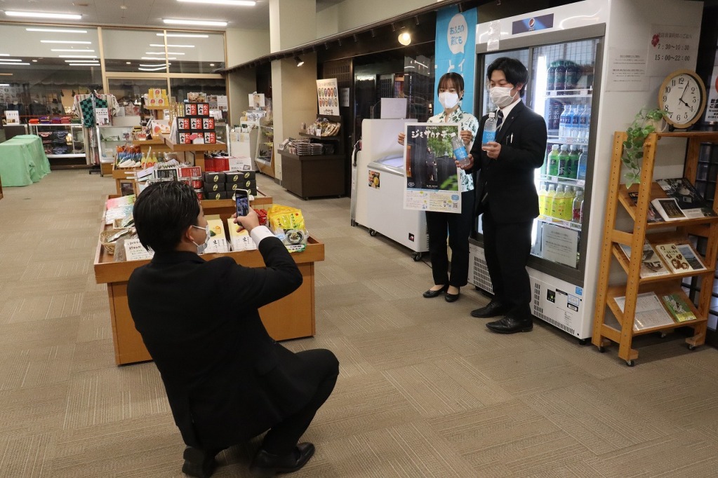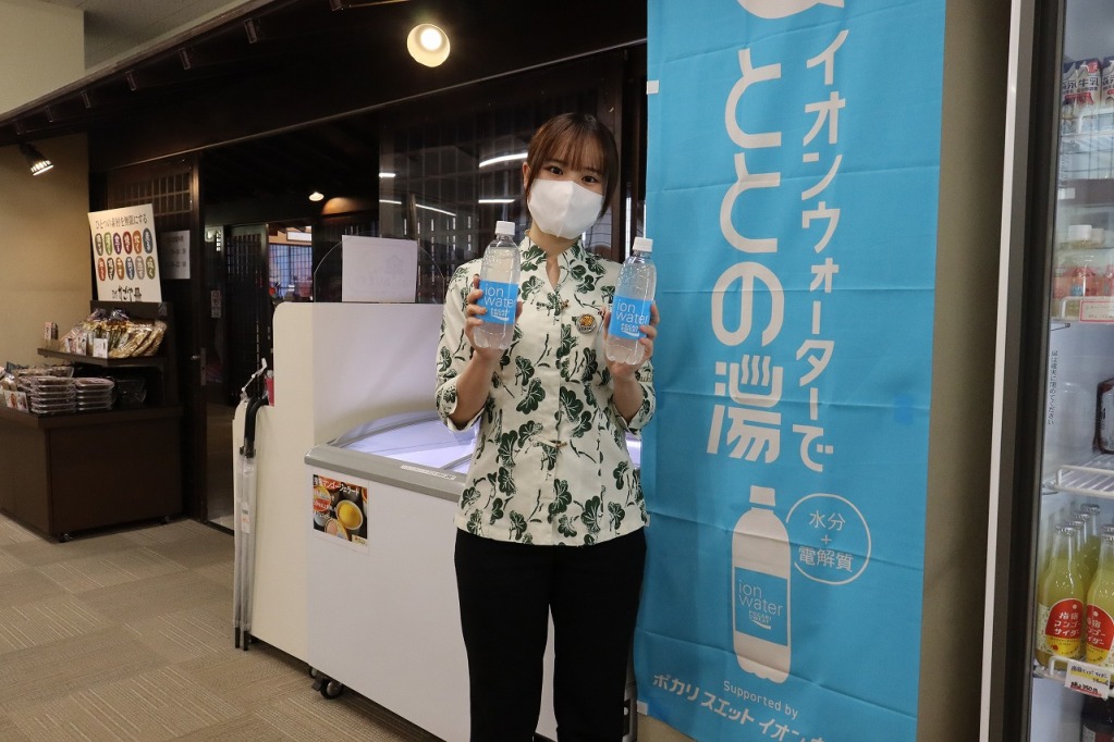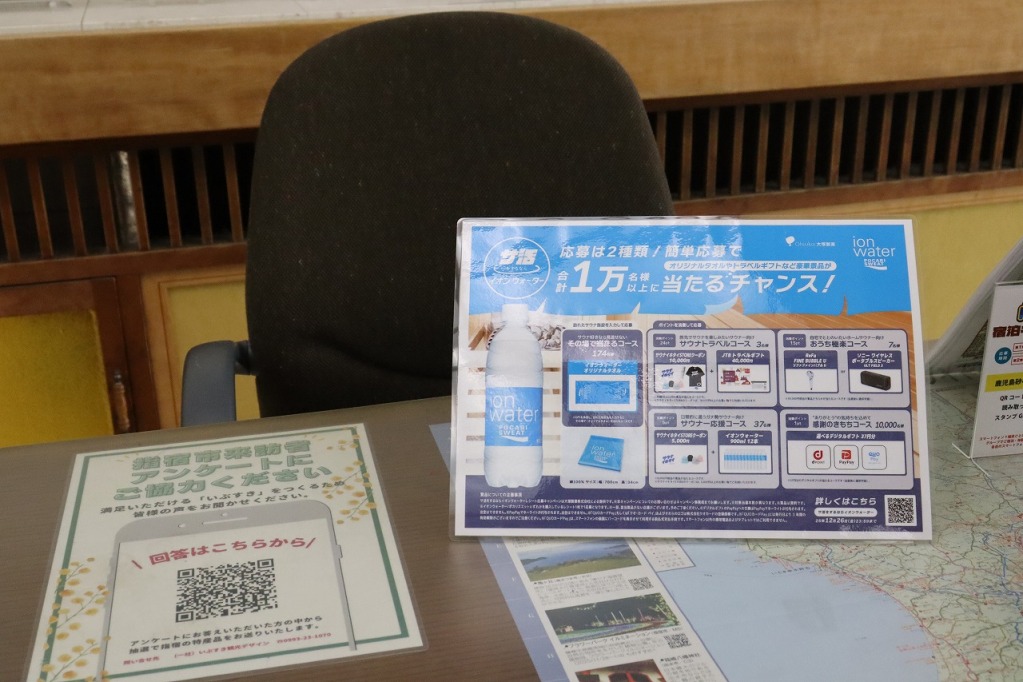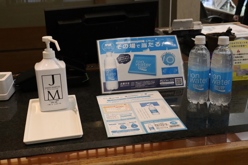 当館フロントにて、鹿児島県・宮崎県内のファミリーマート店舗限定で引換え可能な「ポカリスエット イオンウォーター」500ml無料引換券をご用意いたします。その他にもイオンウォーターのオリジナルタオルや、ステッカーなどが当たるキャンペーンチラシを設置しています。