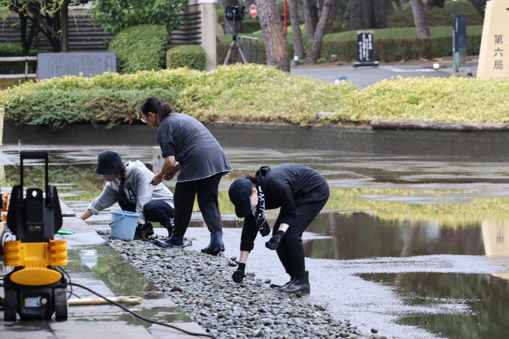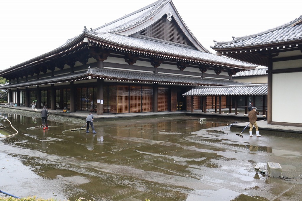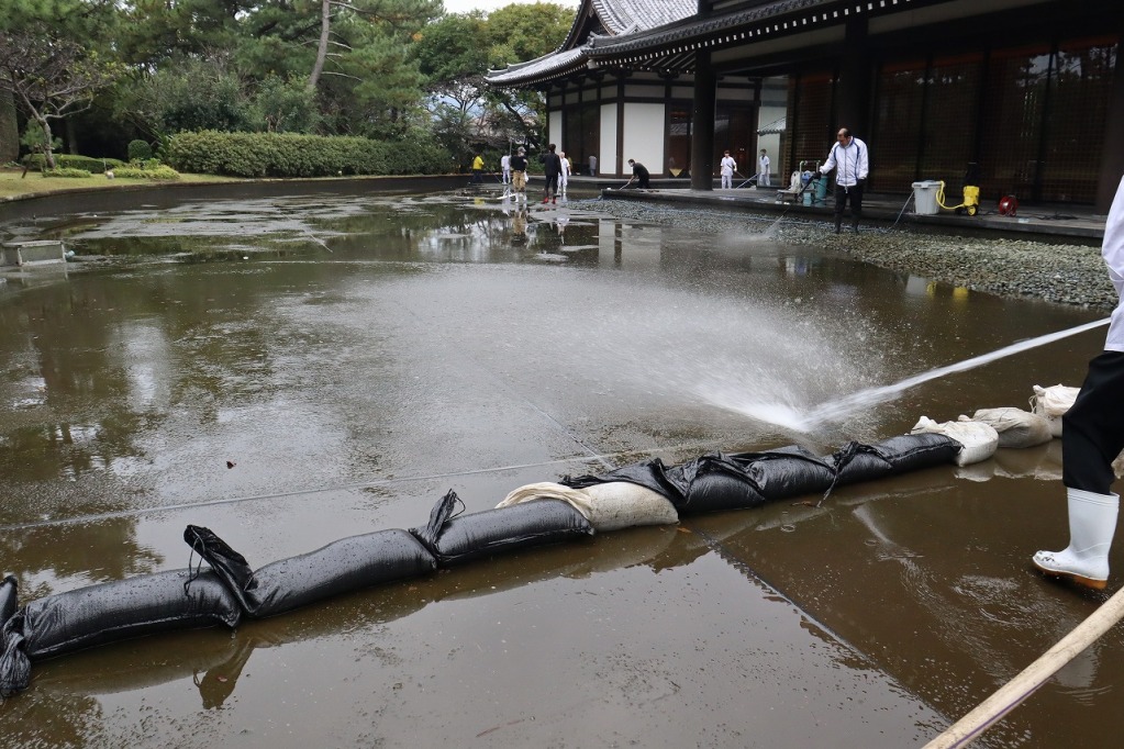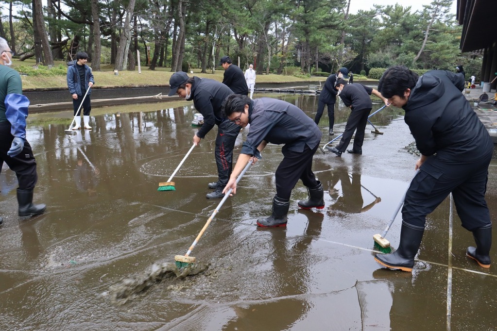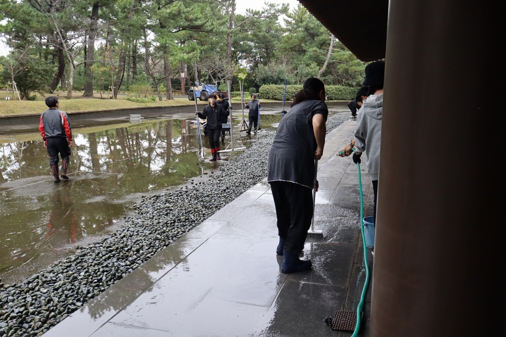 その周囲に玉砂利が敷いてあり、日光で反射したり、夜ライトアップされる時に水の波紋が天井や壁に反射してとても綺麗です。ここにも周囲の松の葉などが飛んでくるので、手作業で取り除いていきます。どの工程も根気のいる作業です。