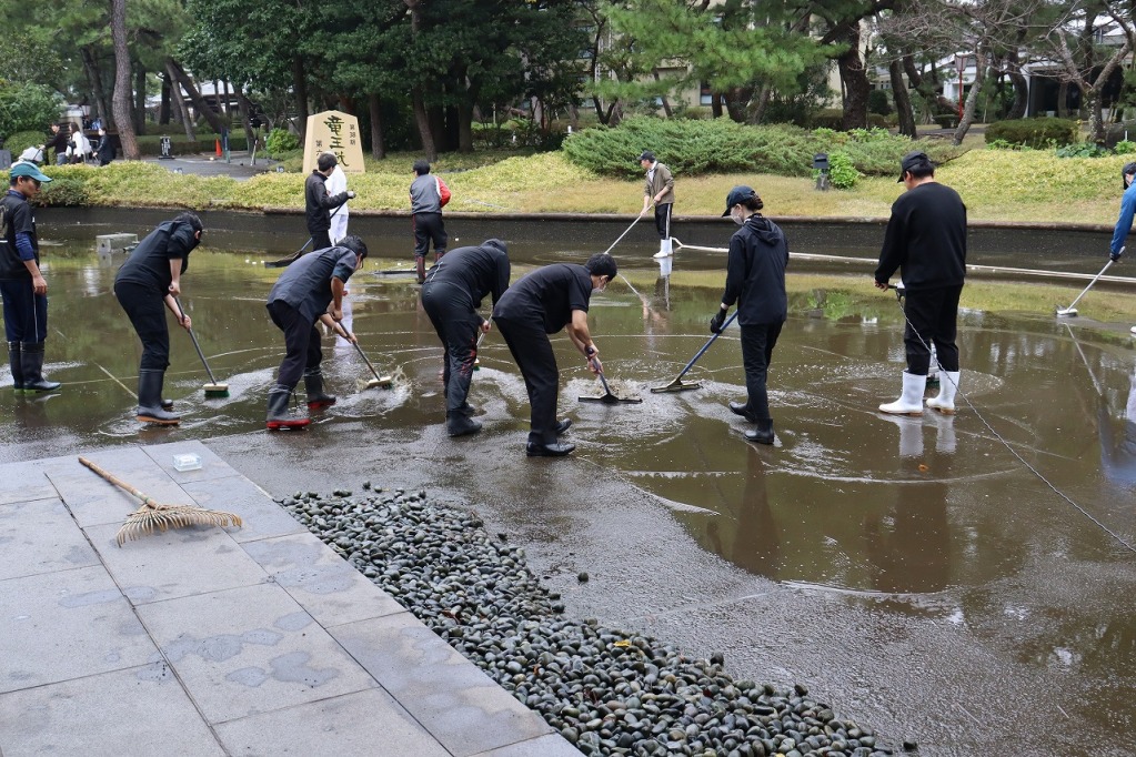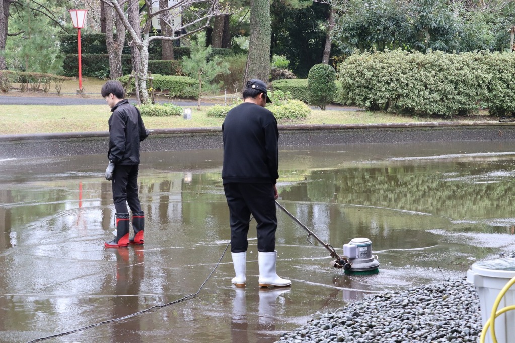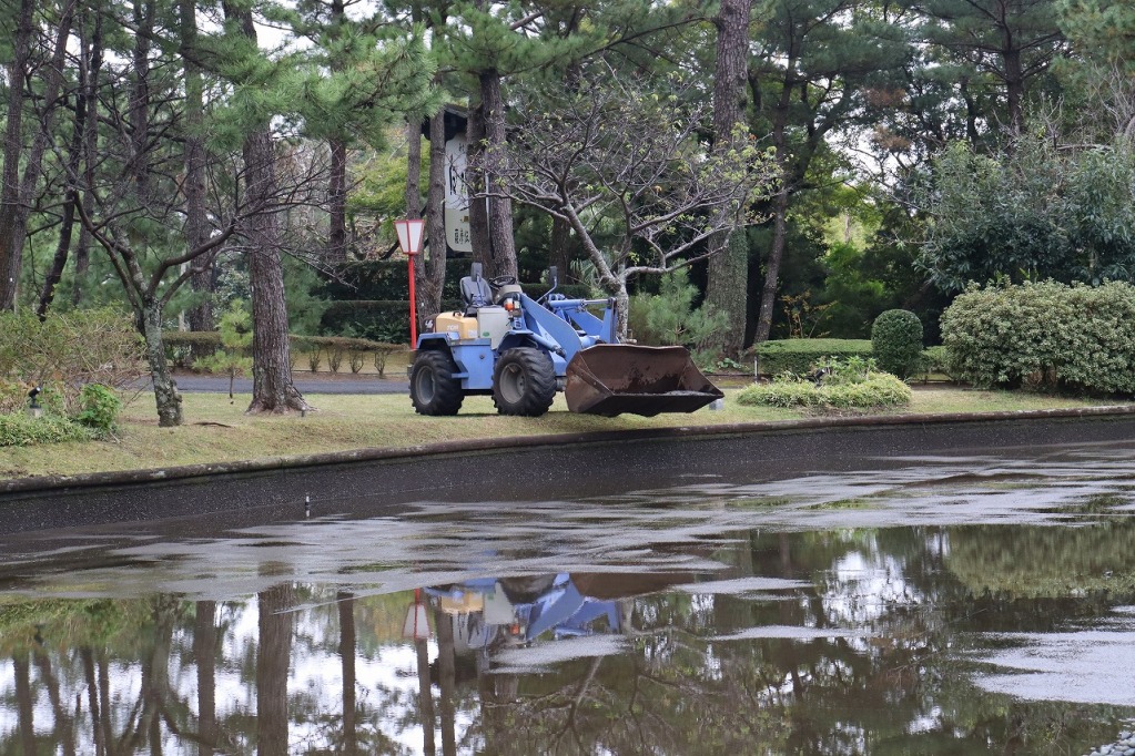 午前中チェックアウト時間が終わると、様々な部署からスタッフが集まり、薩摩伝承館の池の清掃作業を行いました。今日は曇り空ですが、12月に入ってから温かさが戻ってきています。