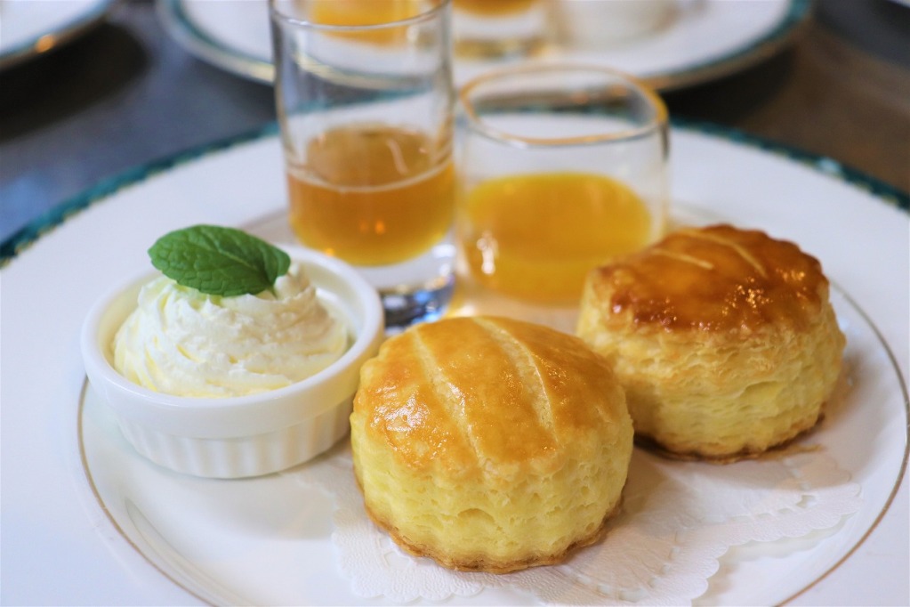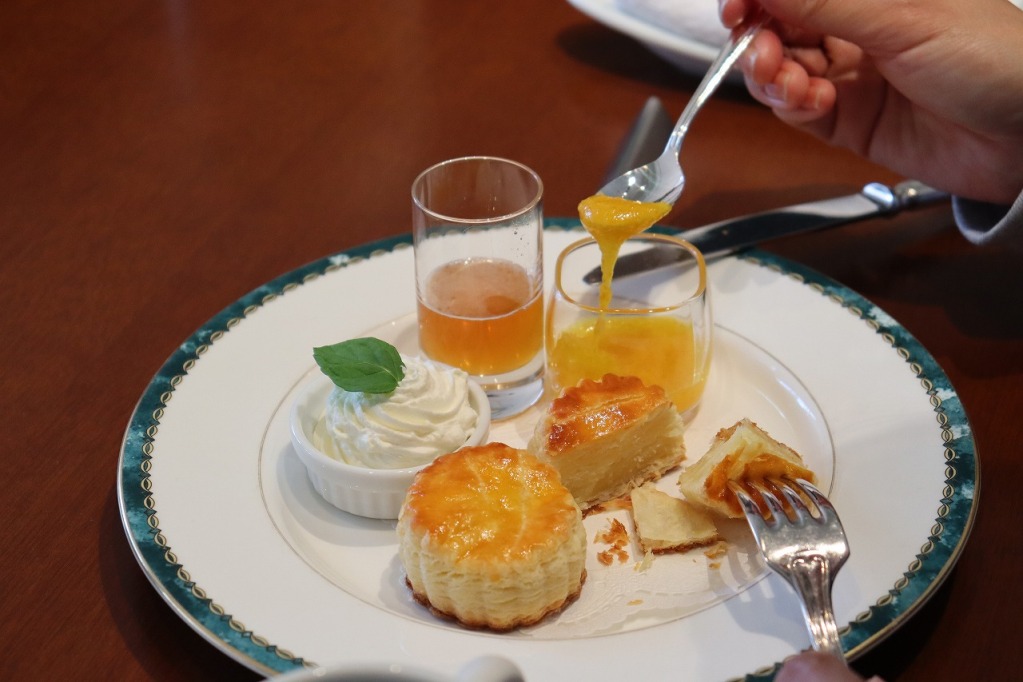 薩摩伝承館でご提供するスイーツ「スコーン」には、日本蜜蜂の蜂蜜、桜島小みかんジャム、サワークリームが添えられています。