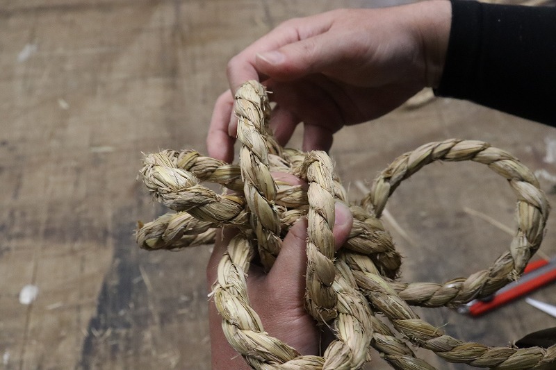 巻いたらゴムバンドで仮止めしながら、藁のロープで絞めていきます。