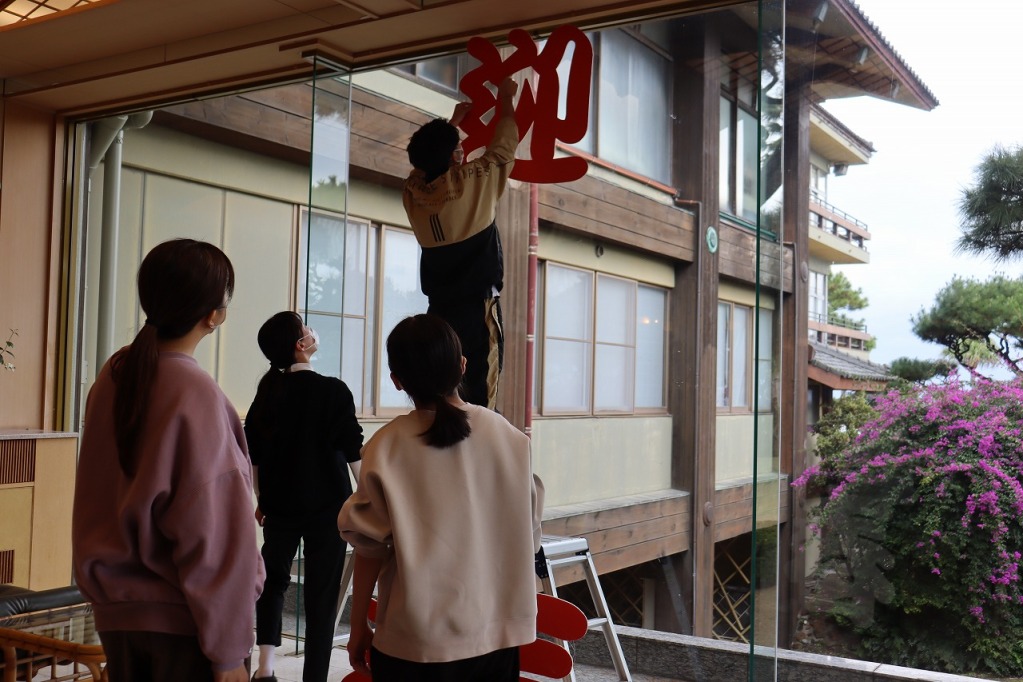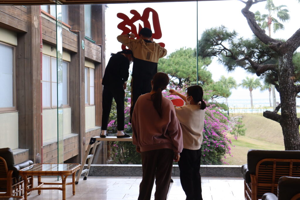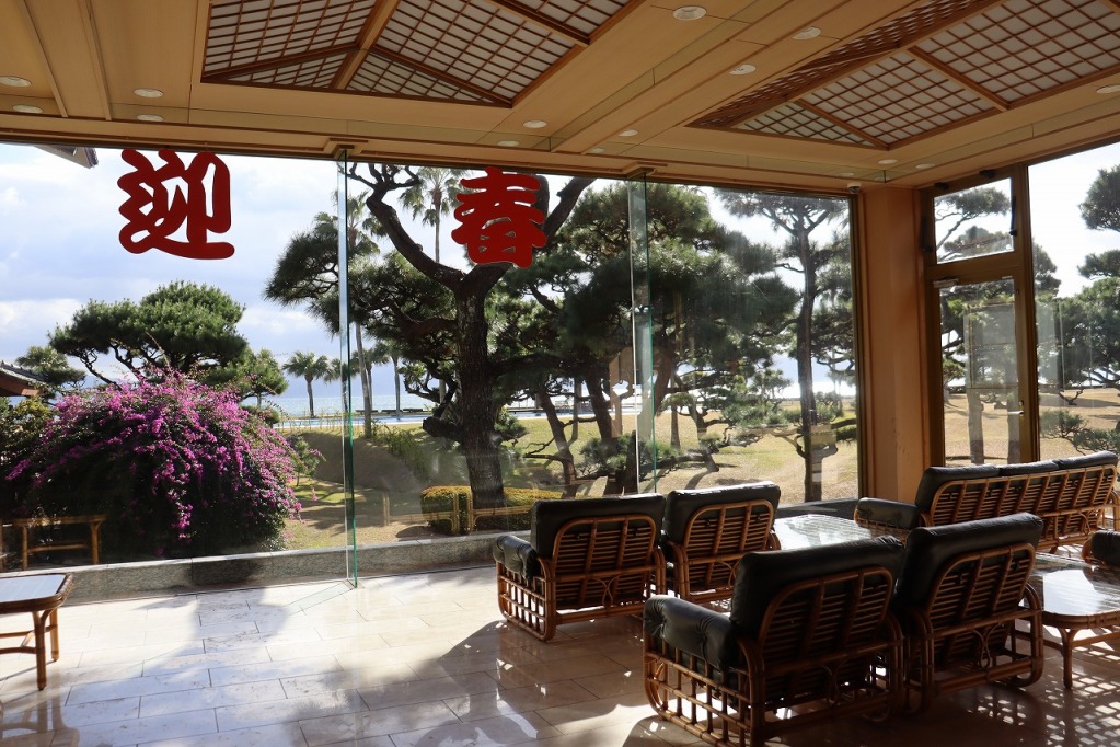ロビーの窓ガラスに毎年掲げられる「迎春」の文字。旧暦では正月節(旧暦12月後半から1月前半)が新しい春を迎える重要な節目でした。このため「春」という字が新年の意味で使われるようになりました。この窓から日の出を見ることもできますが、ブーゲンビレアや松などが目の前にありますので、海側のお部屋なら窓から、またはプールサイドまで出て行って海辺で日の出のご来光を見るのがお勧めです。プールサイドにはIBUSUKIの文字のフォトオブジェもあります。