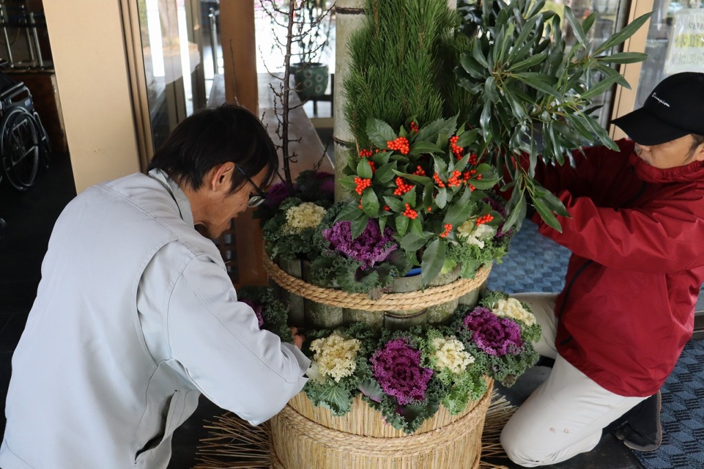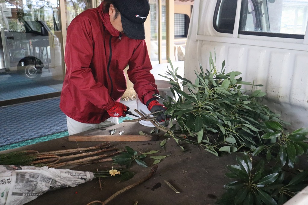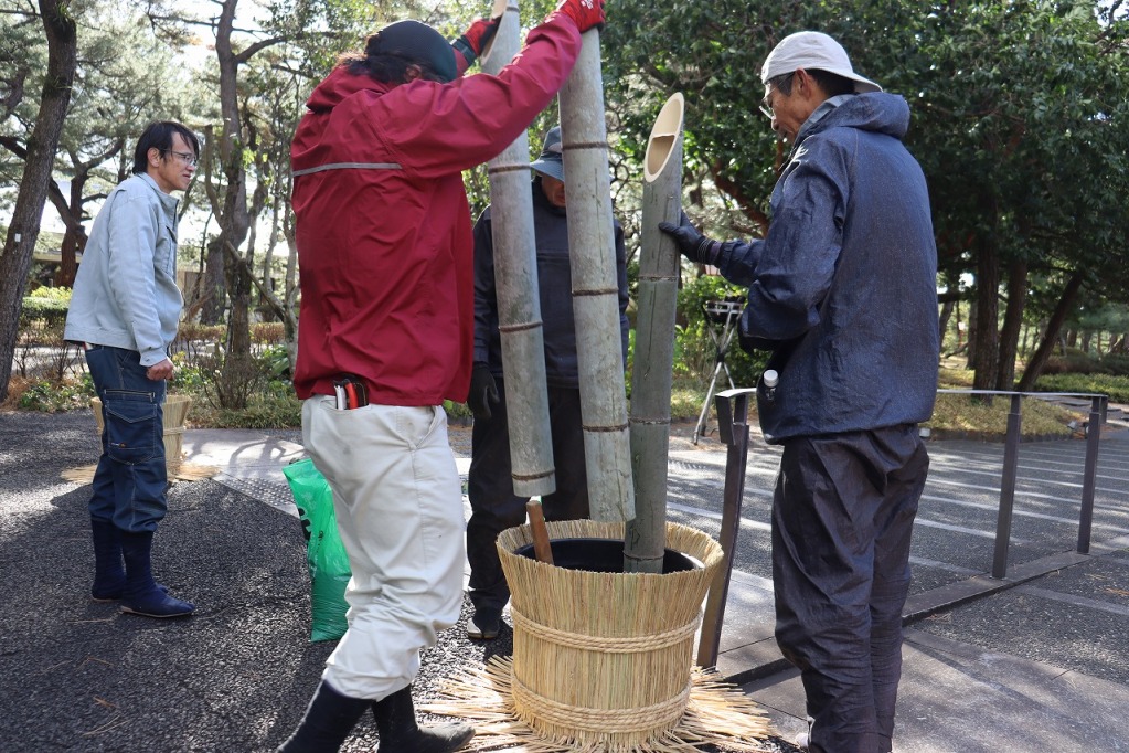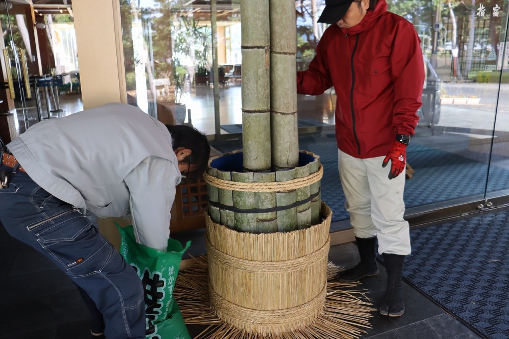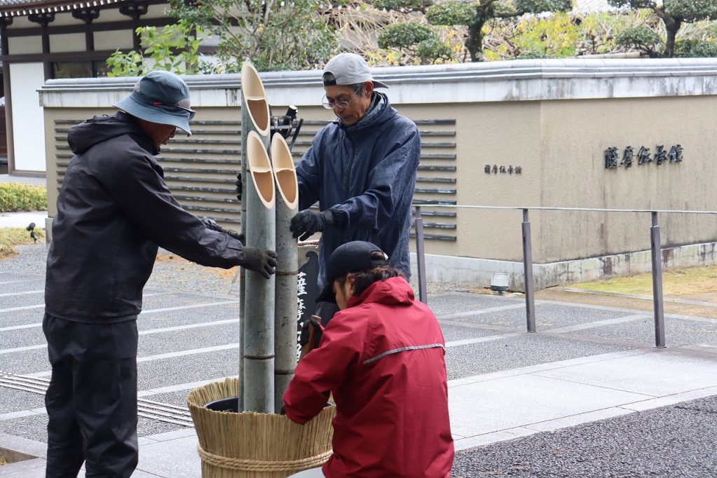 玄関前に門松を設置したあと、園芸スタッフ達は薩摩伝承館の入り口にも門松を設置しています。