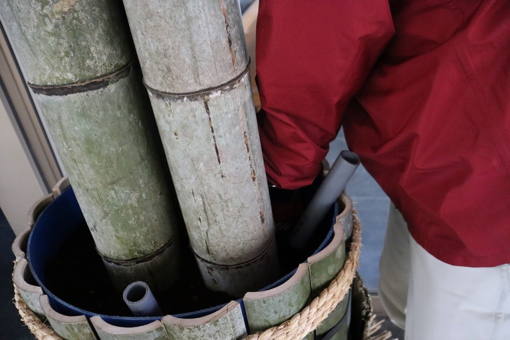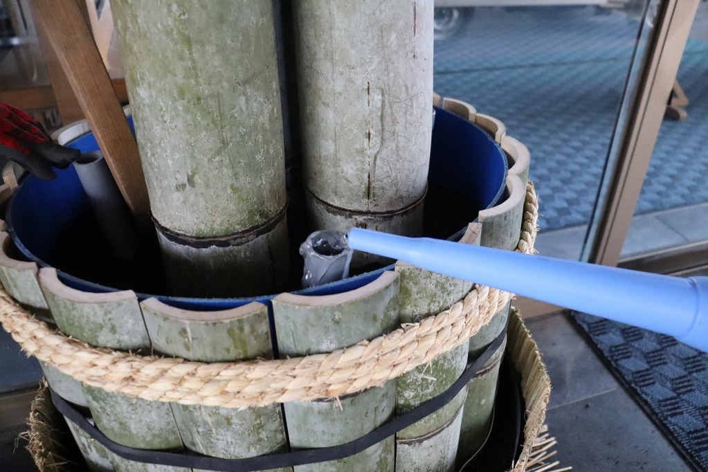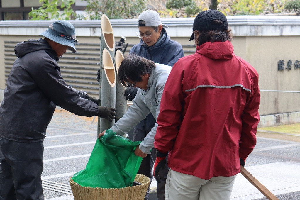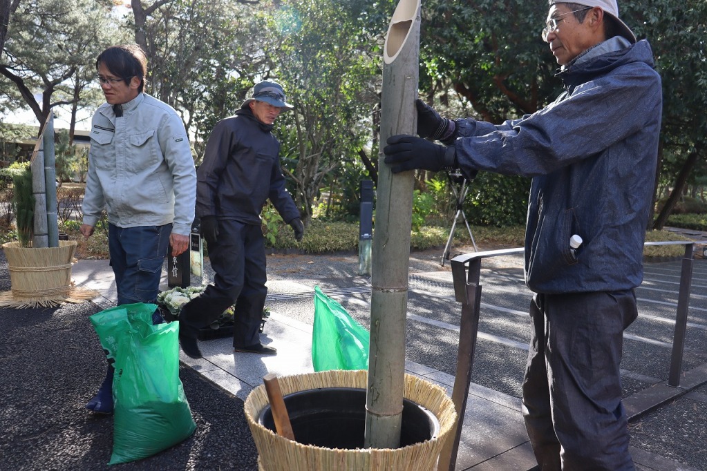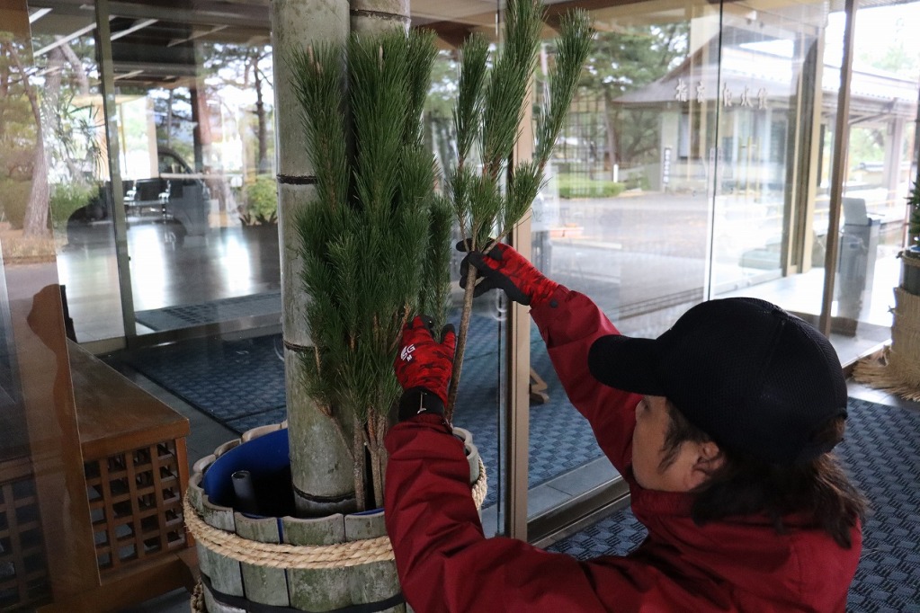 玄関前に門松を設置したあと、園芸スタッフ達は薩摩伝承館の入り口にも門松を設置しています。