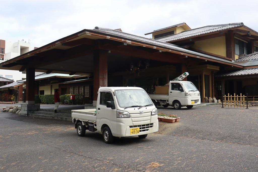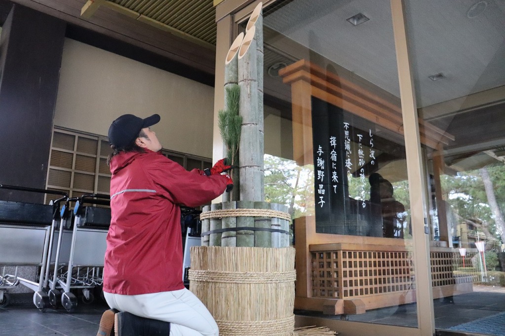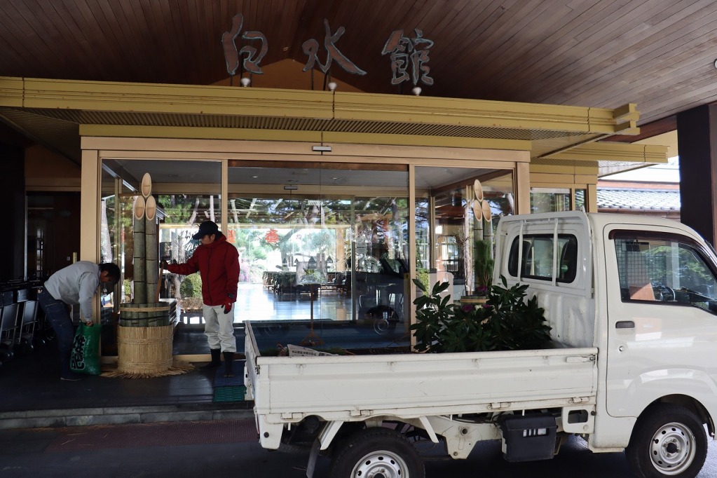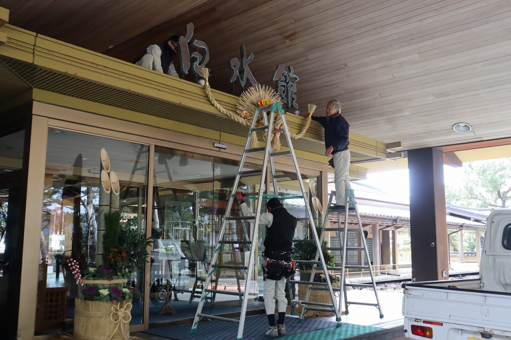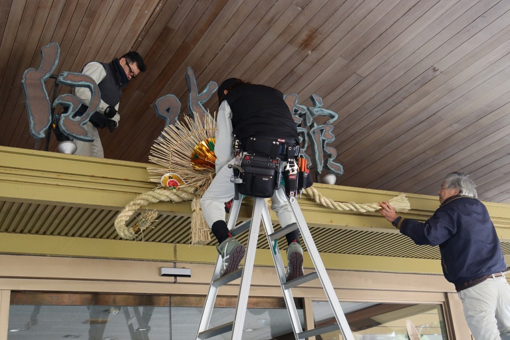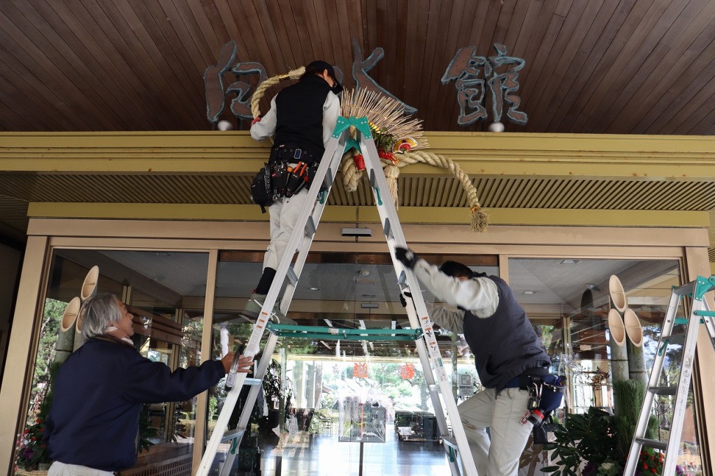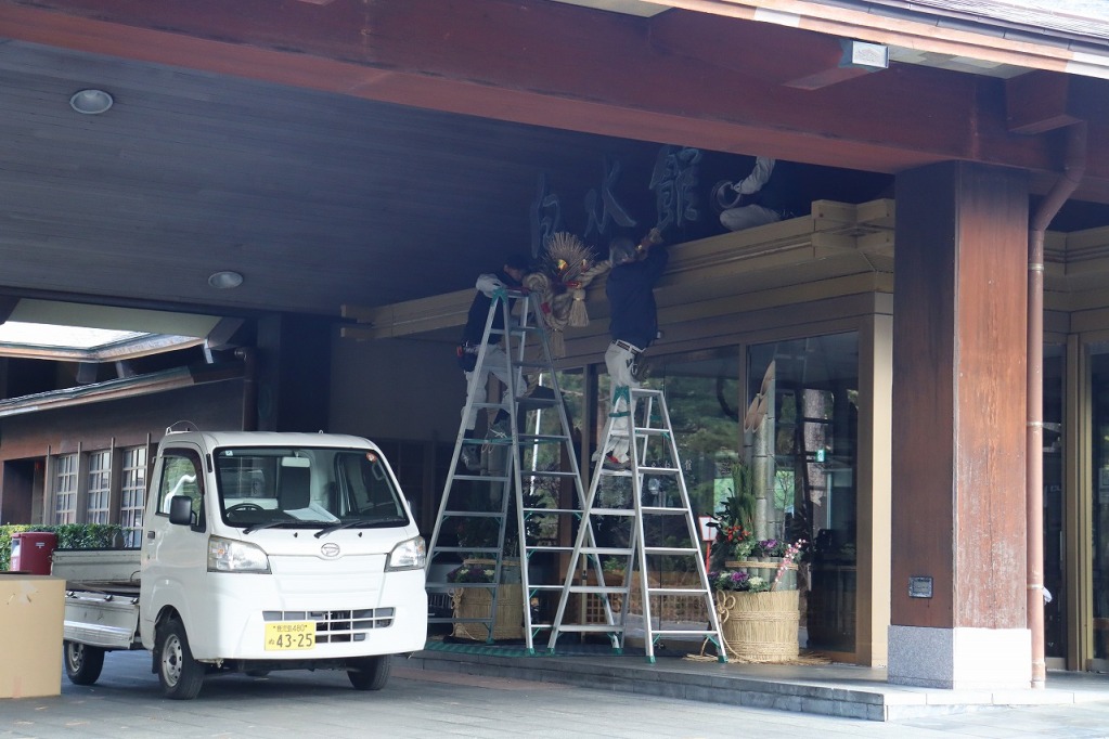 玄関前にある当館の屋号付近には、毎年しめ縄飾りも付けられます。園芸スタッフによる玄関前の門松の設置作業が終わると同時に、施設部の別チームが玄関前に到着して、今度はしめ縄飾りが設置されていきます。