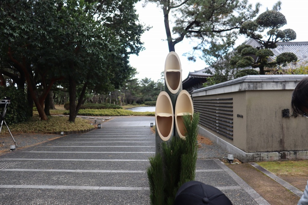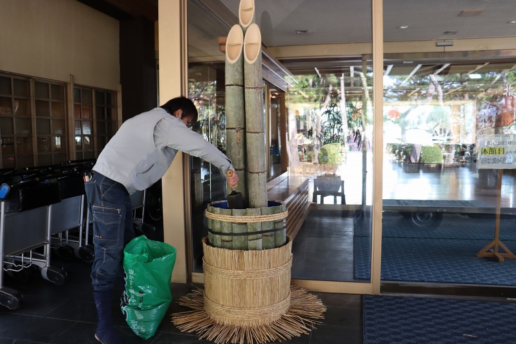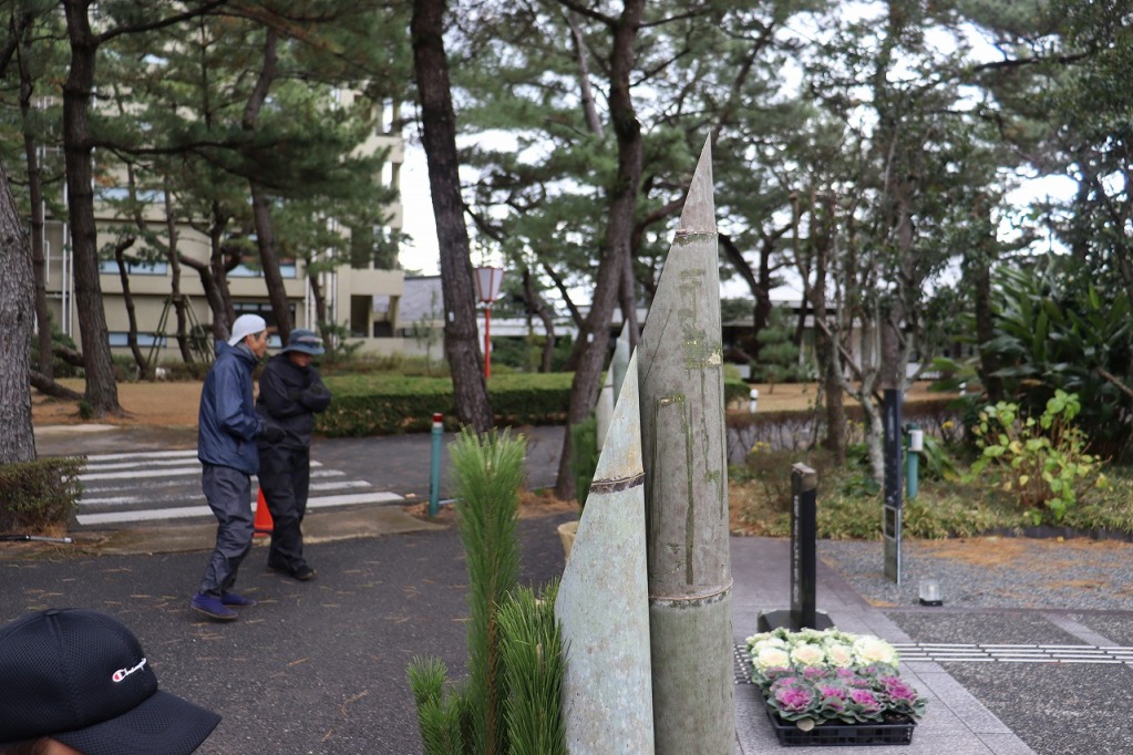 過去のブログでもお伝えしてまいりましたが、当館の門松は毎年園芸スタッフが竹を切るところから手作りで製作しています(*’▽’)