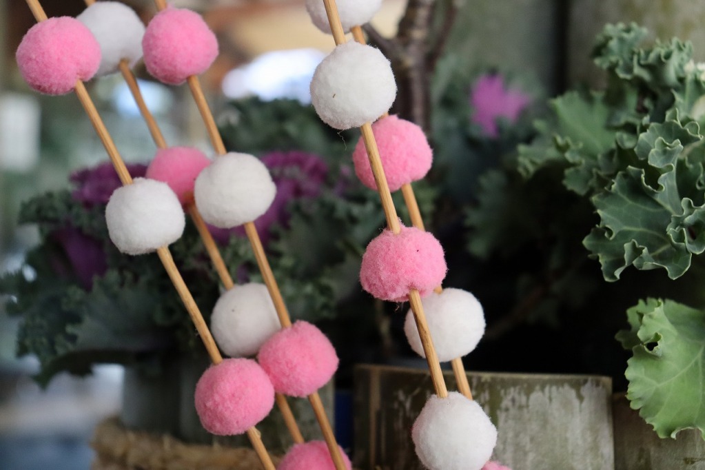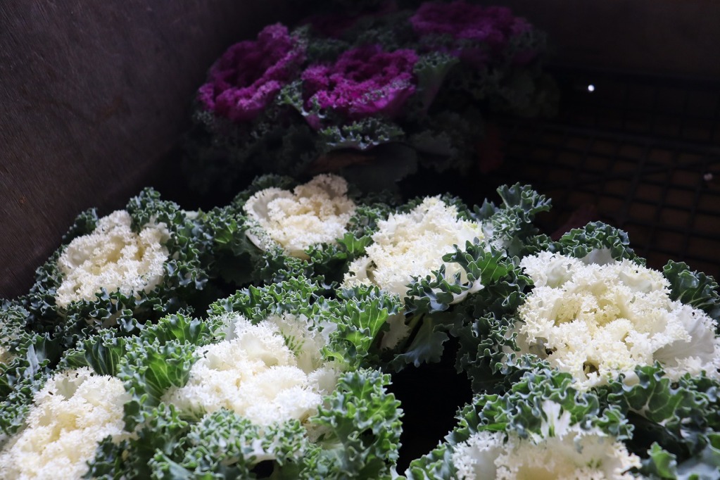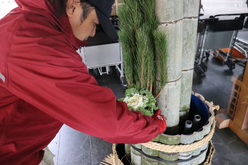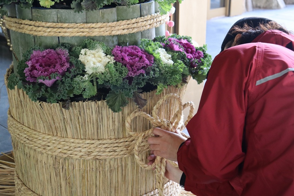 次に葉牡丹を飾り付けます。葉牡丹は、幾重にも重なる葉が「幸運が重なる」ことを、紅白の色が「紅白でおめでたい」ことや「祝福」を意味していて、花言葉の「祝福」「利益」「慈愛」とも相まって、縁起物として飾られます。元々は高価な牡丹の花の代用として、江戸時代に門松に用いられるようになった歴史があるそうです。