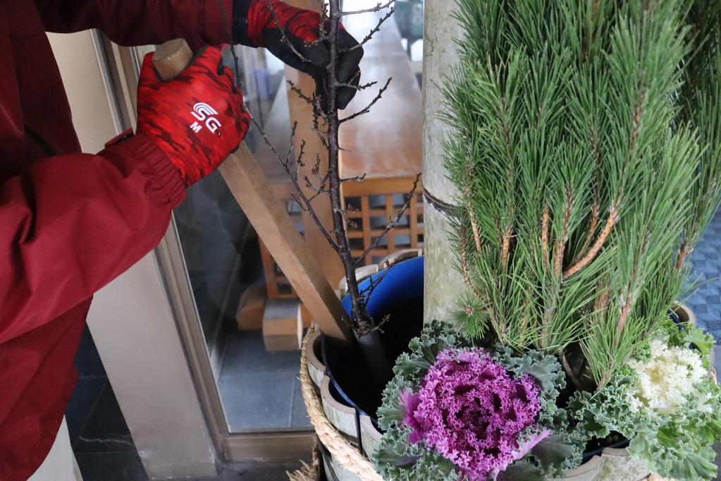 竹が固定されて、松がしっかり正面を向いて位置を整えたあと、玄関前と同じように蕾を付けた梅の枝や南天の枝を指すパイプを差し込んでいきます。