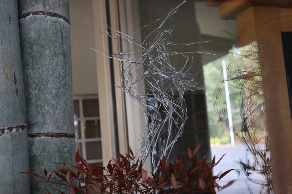 正面から見てバランスを確認しながら、門松が整えられていきます。このあと、銀竹飾りなどが添えられて華やかさを増していきます。下の赤い葉は南天の葉です。南天(ナンテン)は、「難(なん)を転(てん)ずる」という語呂合わせから、厄除け・魔除けの意味を持ち、「難を転じて福をなす」という縁起の良い植物とされています。赤い実が成るのも特徴で、お正月に華やかさを添え、神様を迎える目印としても使われ、家庭の繁栄や健康を願う意味が込められています。