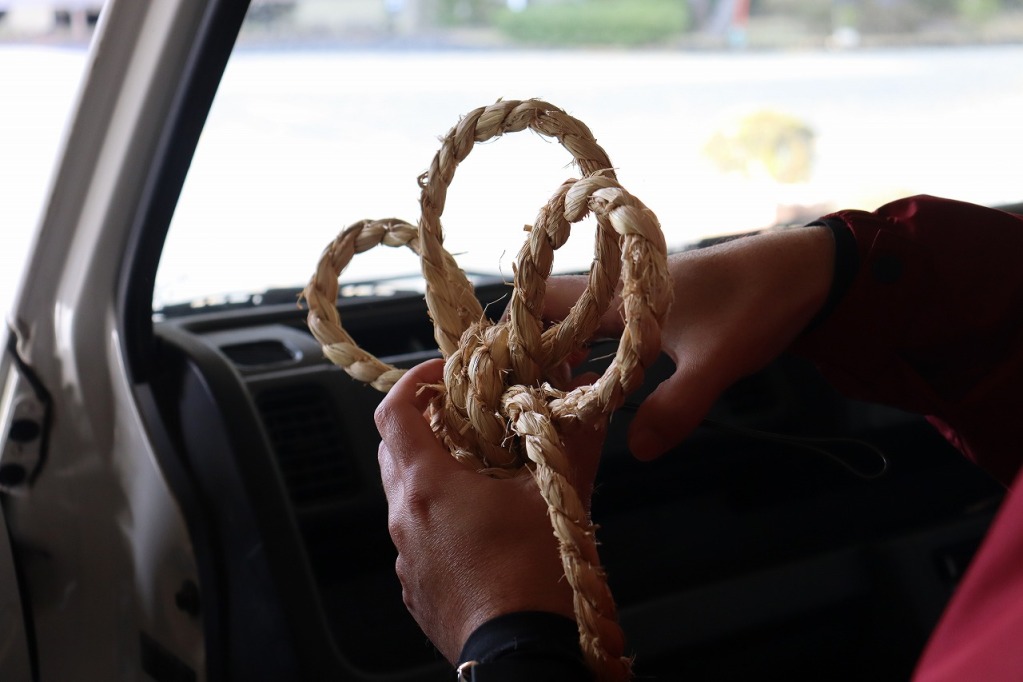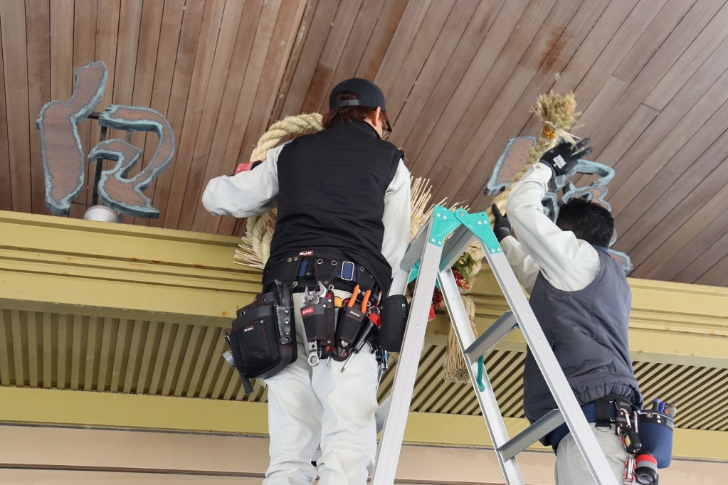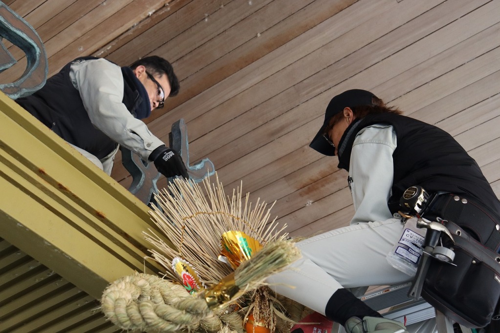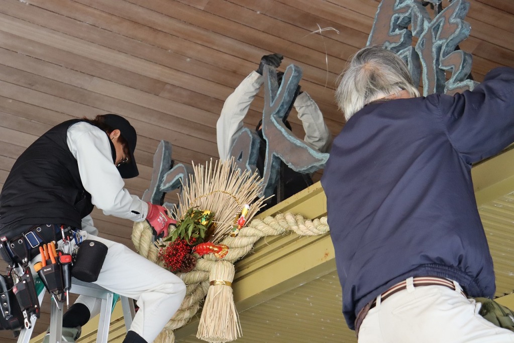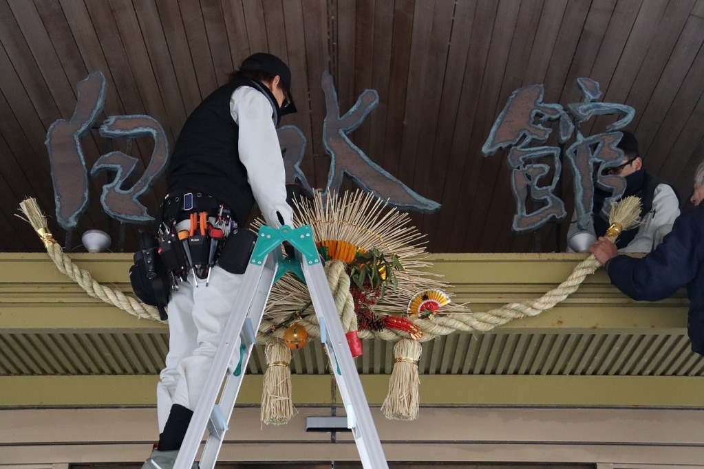 高さのある脚立に登って、重量のあるしめ縄飾りが持ち上げられていきました。