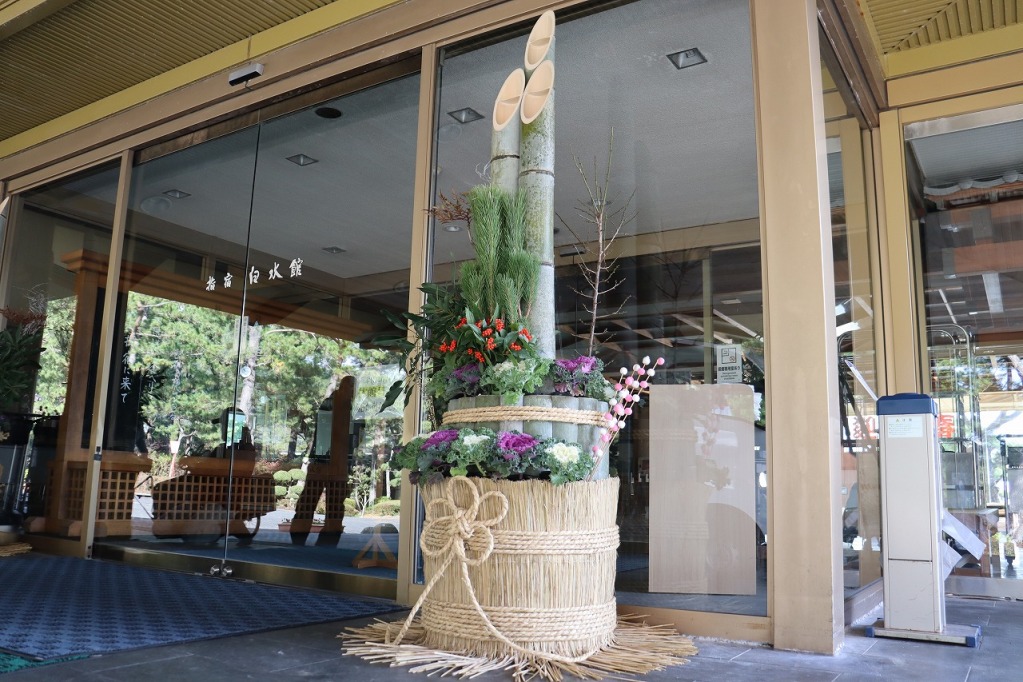 休館日明けの今日12月26日、玄関前に門松としめ縄飾りが設置されました。