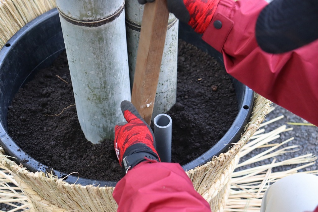 土によって中心の竹がしっかりと固定されるまで支えられています。