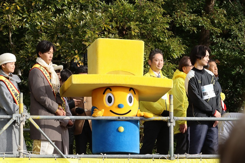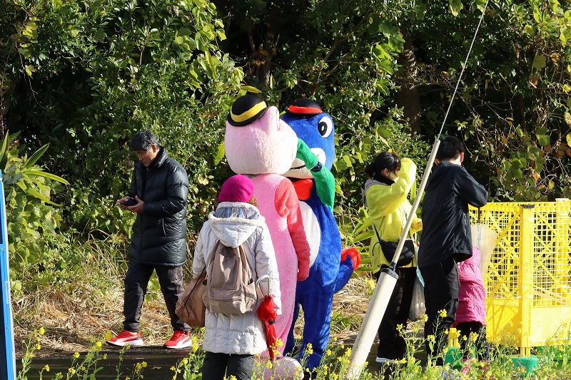 指宿市にあります、九州最大のカルデラ湖、池田湖のマスコットキャラクターいっくんとシーちゃんも応援に駆けつけていました。