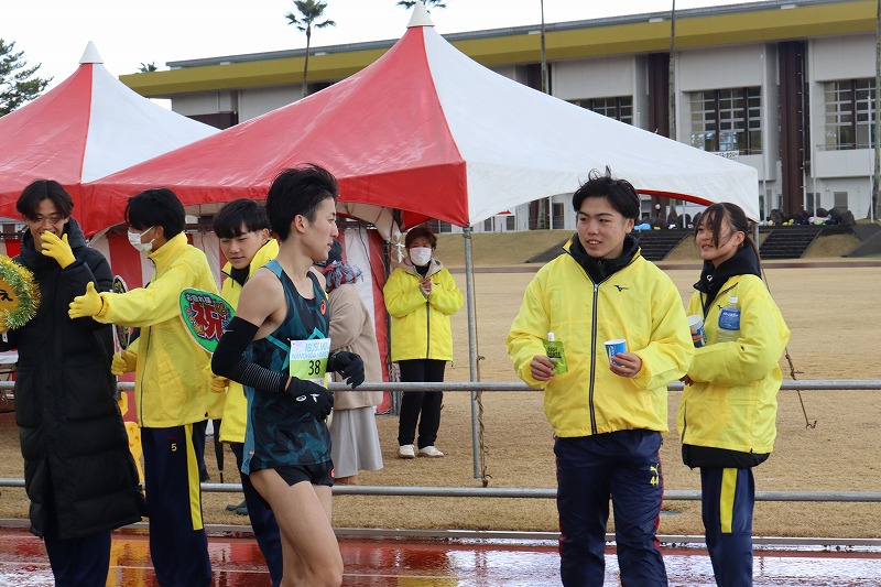 トップのランナーが指宿陸上競技場へ戻ってきました。
