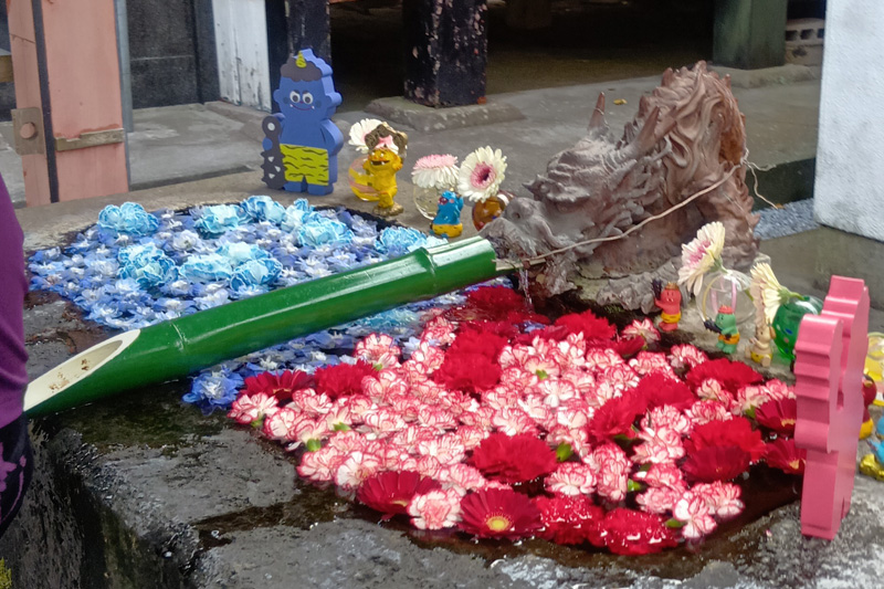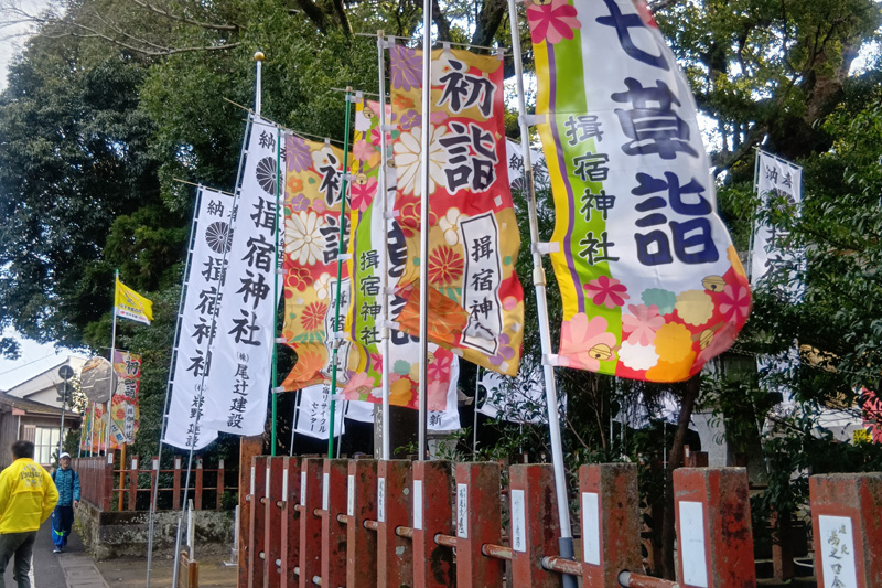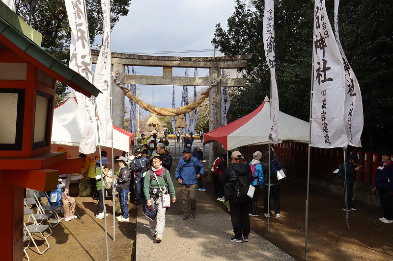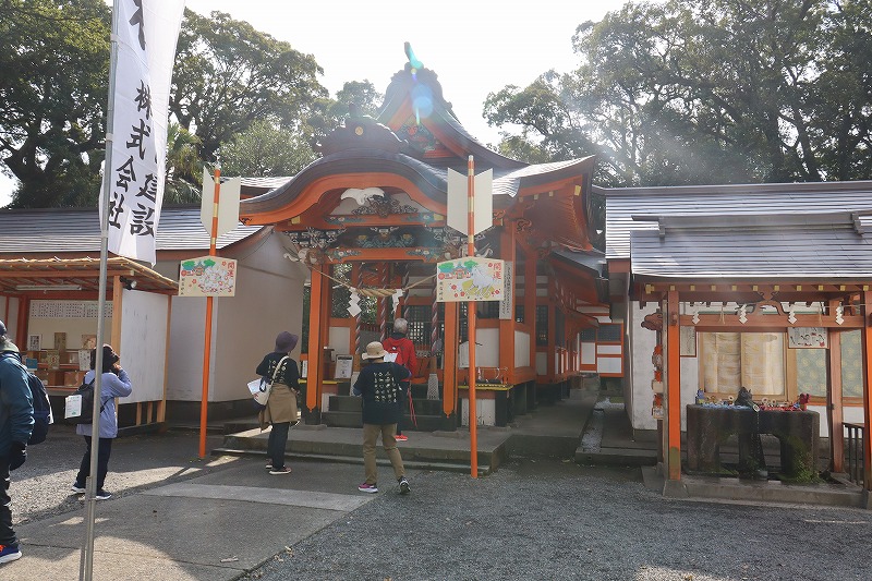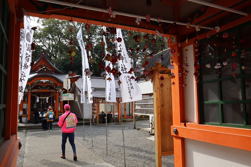 こちらは15kmゆったり湯めぐりコースのエイドとなった揖宿神社です。天智天皇にゆかりのある由緒正しき古社として有名で、近年では季節ごとに彩りを変える「花手水」や月替わりの御朱印など、写真映えするパワースポットとしても人気を集めています。