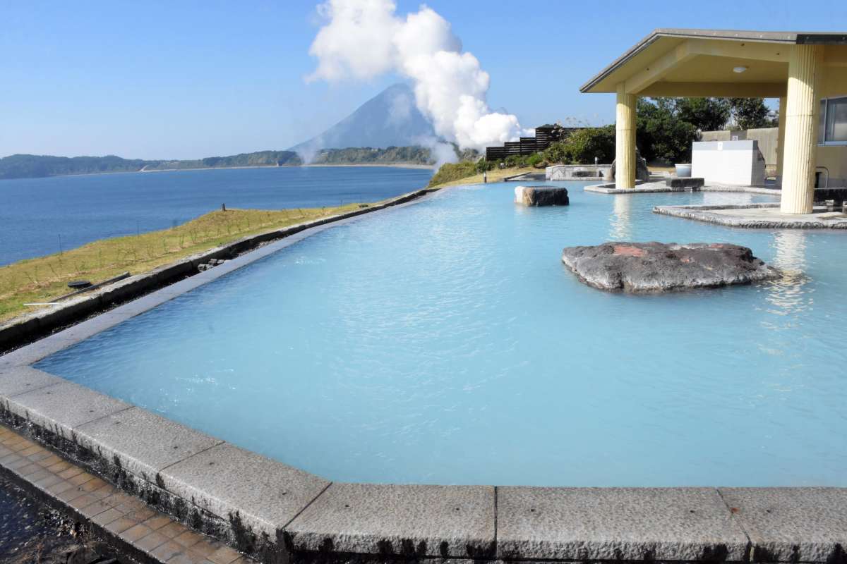 露天風呂たまて箱温泉はトリップアドバイザーの「行ってよかった日帰り温泉&SPA」で4年連続全国1位に輝いた名湯です。薩摩富士と呼ばれる「開聞岳」を望む和風露天風呂と、奇抜な形の竹山と海が一体となる洋風露天風呂があって、男女日替わりで楽しめます。昨年のリニューアルを機に新たな源泉を使用しており、天然の保湿成分「メタケイ酸」を多く含んだ青みがかった乳白色の湯が特徴です。