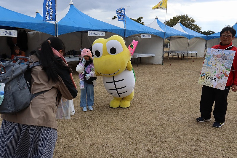 南さつま市の吹上浜砂の祭典のマスコットキャラクター『サンディーくん』も応援に来てご来場者の方と記念撮影もされていました。今月28日には、「第14回 南さつま海道 鑑真の道歩き」が開催されるほか、5月3日からは「第39回 吹上浜砂の祭典」が開催されます。