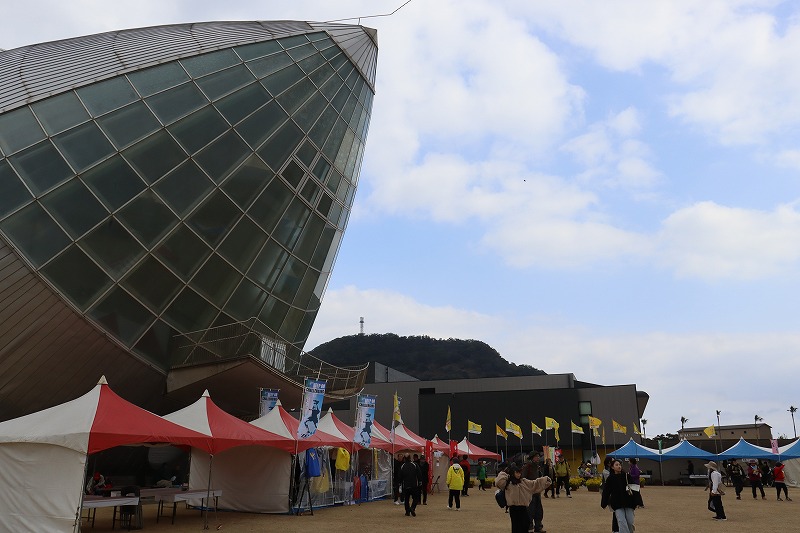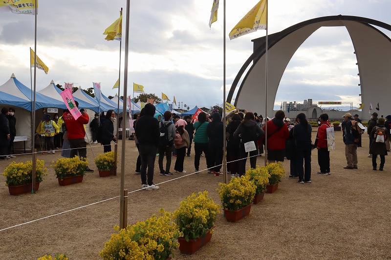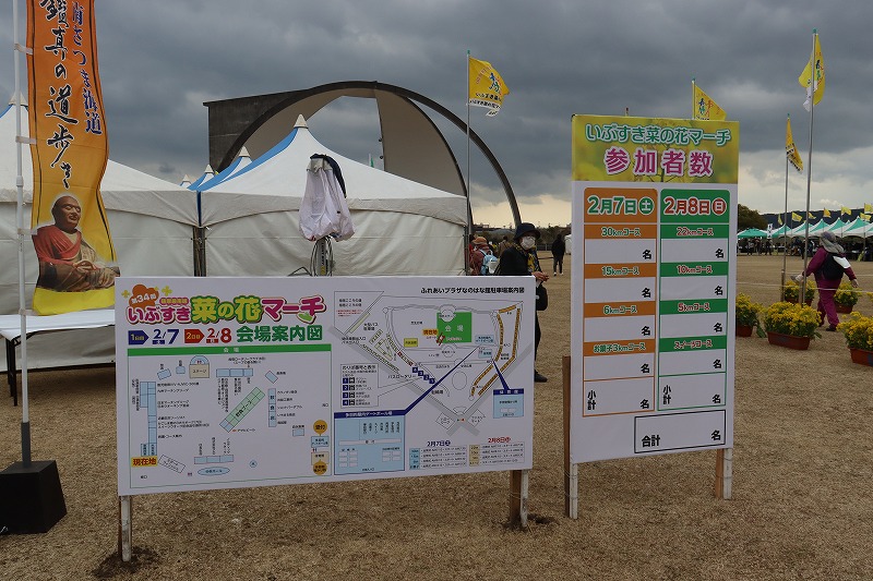 指宿市「ふれあいプラザ菜の花館」広場が大会のメイン会場としてスタート&ゴール地点になっています。去年の大会ではフラワーパークかごしまがメイン会場となり、この2つの会場が毎年交互に使われています。