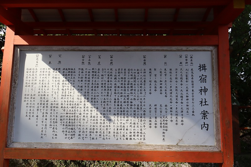 当館も一年を通してご神事の際に大変お世話になっている神社です。旧名を「開聞新宮九社大明神」といって、かつては「しんぐう神社」とよばれていました。樹齢1,130年の大きなクスノキが数株あり、樹齢500年の大銀杏やムクノキ、ナギノキの大木が多くあることから、揖宿神社の社叢(しゃそう=森)は鹿児島県天然記念物に指定されています。