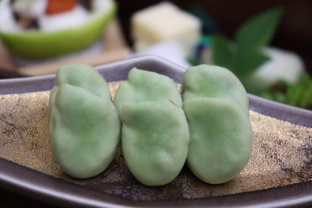 鹿児島県指宿市は、そら豆の作付け面積と出荷量ともに、他県を大きく引き離して全国第1位です。農協などでの共販を中心に主に東京などの県外に出荷されています。指宿市では全国に先駆けて12月頃からそら豆の収穫が始まり、1月〜4月頃が最盛期となる「極早生(ごくわせ)」の産地です。温暖な気候を活かして冬の間に旨味を蓄え、甘みとホクホクとした食感が特徴の、一足早い春の味覚として知られています。当館では和食会席の前菜(写真上)やイタリアン(ランチとディナー)でご提供しています。