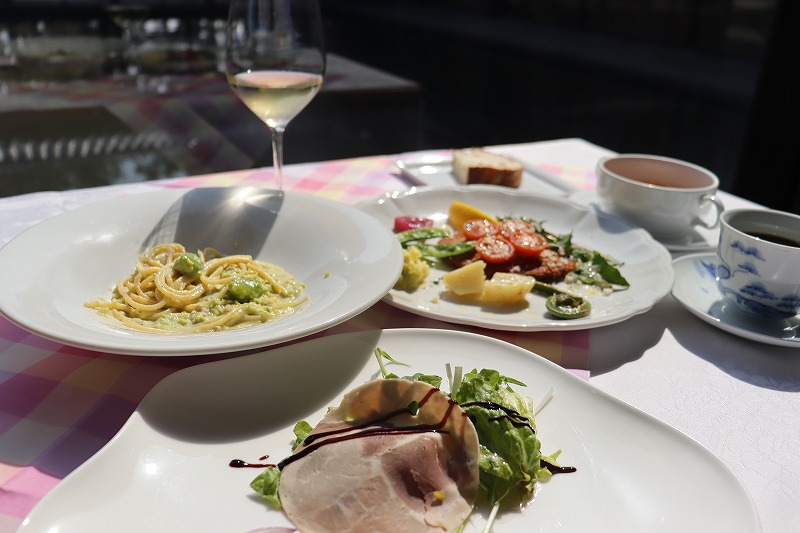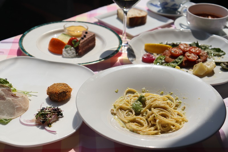 そら豆のパスタを含むランチメニューで、お昼のコース【B】 ~ Pranzo B ~の一例となります。