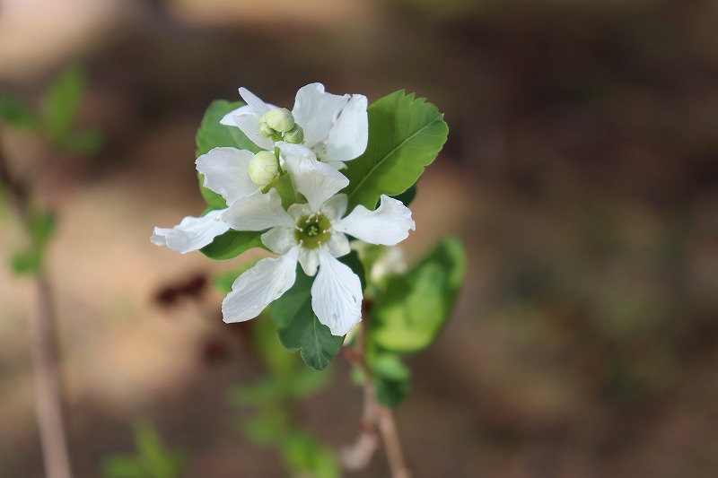 日本では4〜5月頃に白く清楚な花を咲かせるのが一般的で、桜が散った後の、初夏の訪れを感じさせる晩春に楽しめる花木とされていますが、指宿では3月初めに咲き始めています。中国原産のバラ科落葉低木です。