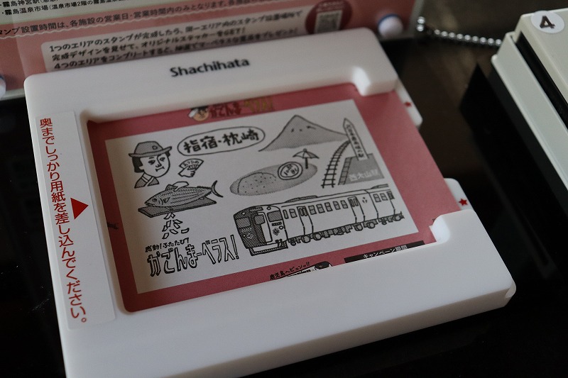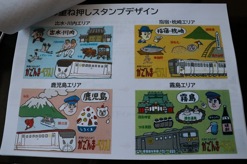 薩摩伝承館は黒インクでスタンプされます。カゴマニア独特の可愛い絵柄でこれは集めたくなりますね!温泉やJR日本最南端の駅など、各地の観光を楽しみながらぜひ集めてください(*’▽’)