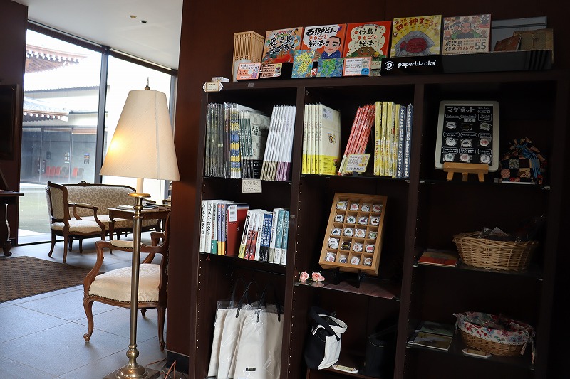 薩摩伝承館入り口のレセプションには、鹿児島にまつわる、美術館ならではのお土産(書籍、ご当地すごろく、缶バッジ、焼物、薩摩切子などなど)が色々と揃っています。