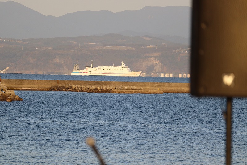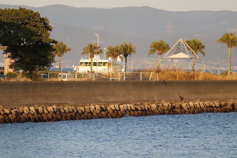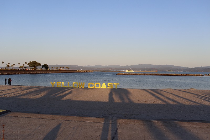 写真左奥に見えているのが指宿港、対岸に見えるのが大隅半島で南大隅町辺りが見えていると思います。指宿港海岸には近年「YELLOW COAST」のロゴオブジェが設置されました。現在、指宿港海岸では付近の太平次公園(幕末期に薩摩国の商人だった濱崎太平次に由来)から大山崎まで約1.8kmの区間を2027年度の完了を目指して国直轄による防災事業が進められています。