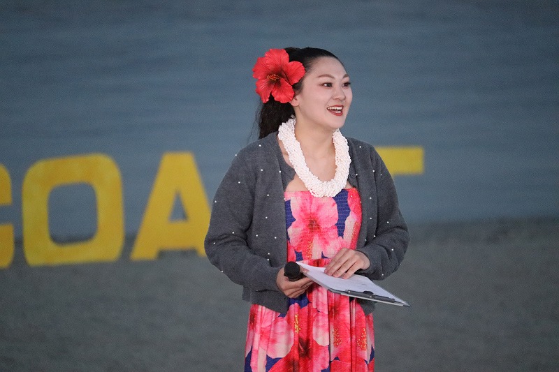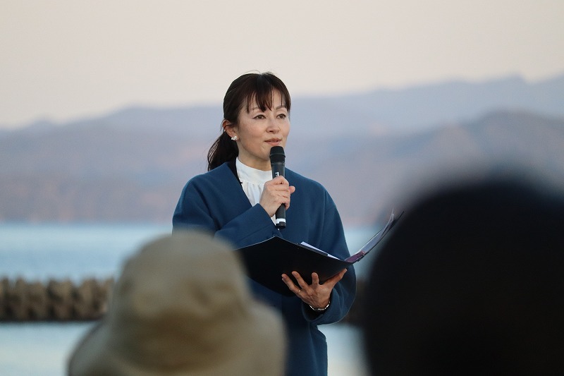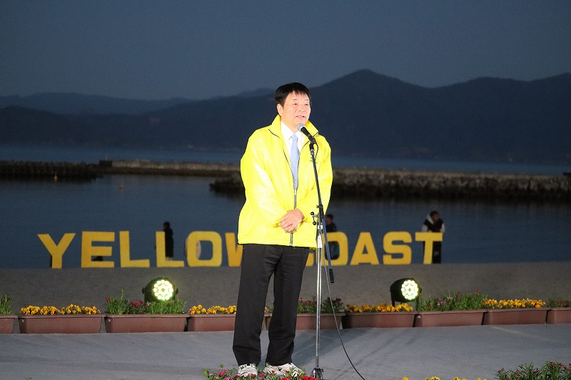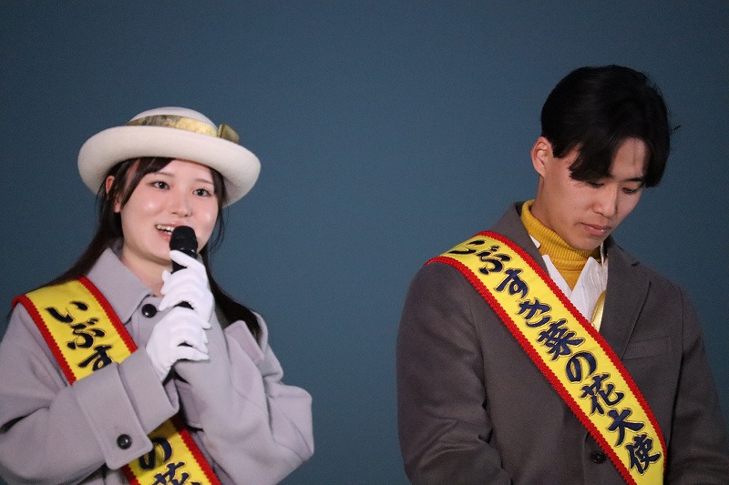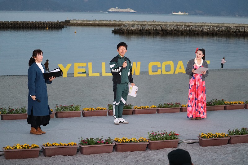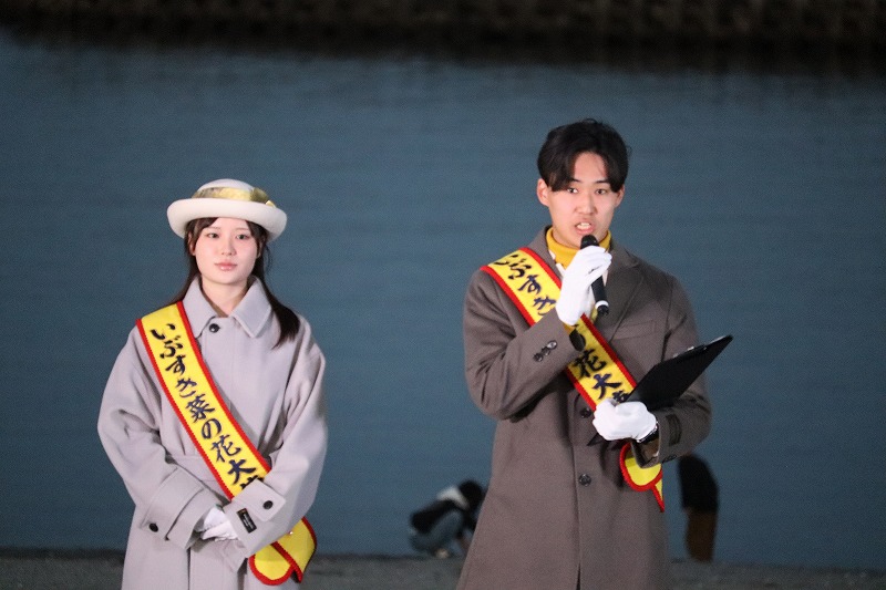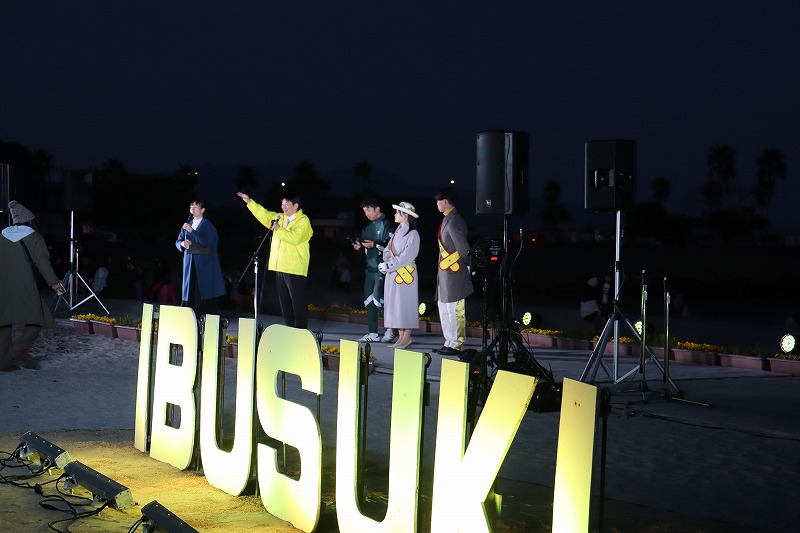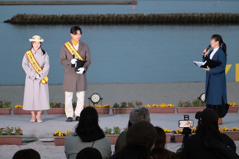 18時半過ぎ、だいぶ日が沈んで薄暗くなってきました。いよいよ指宿港海岸緑地帯照明点灯式が始まりました。特設ステージに第5代いぶすき菜の花大使の出口花野さん、住谷凜太さんが登場して点灯式に向けて挨拶されました。