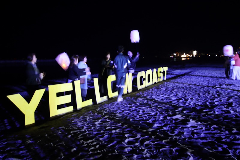 19時半になり、LEDランタンとしゃぼん玉を使って幻想的な空間を演出する「みんなでつくる光のビーチ」がいよいよ始まりました!YELLOW COASTのロゴオブジェ周辺に申込された皆さんが集まってきました。